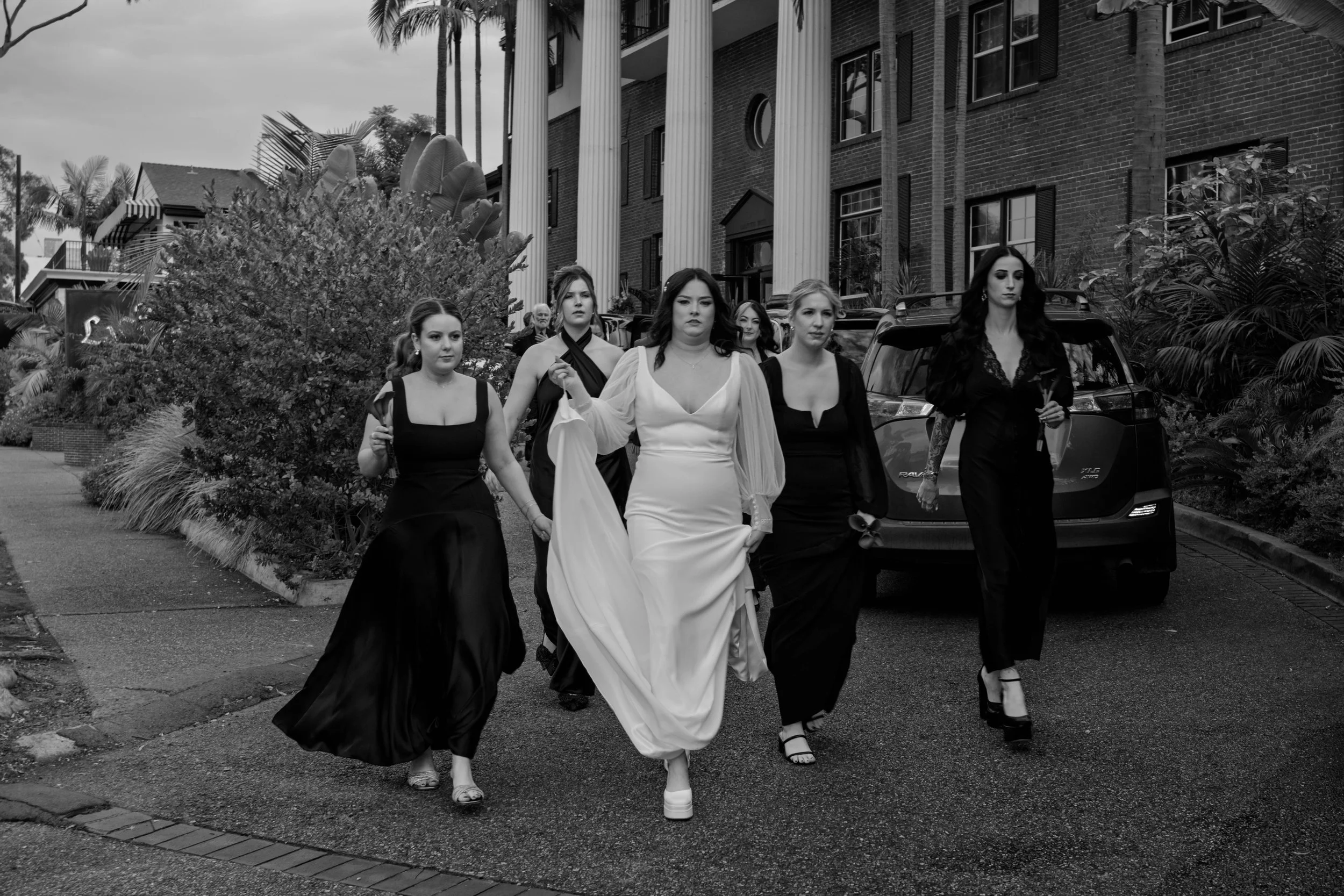 A group of women in black and white evening gowns walking outside on a wet street, with trees and a building with columns in the background.