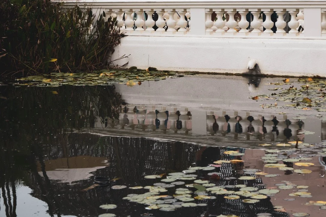 A pond with lily pads and floating leaves, a white decorative fence, and water reflections.