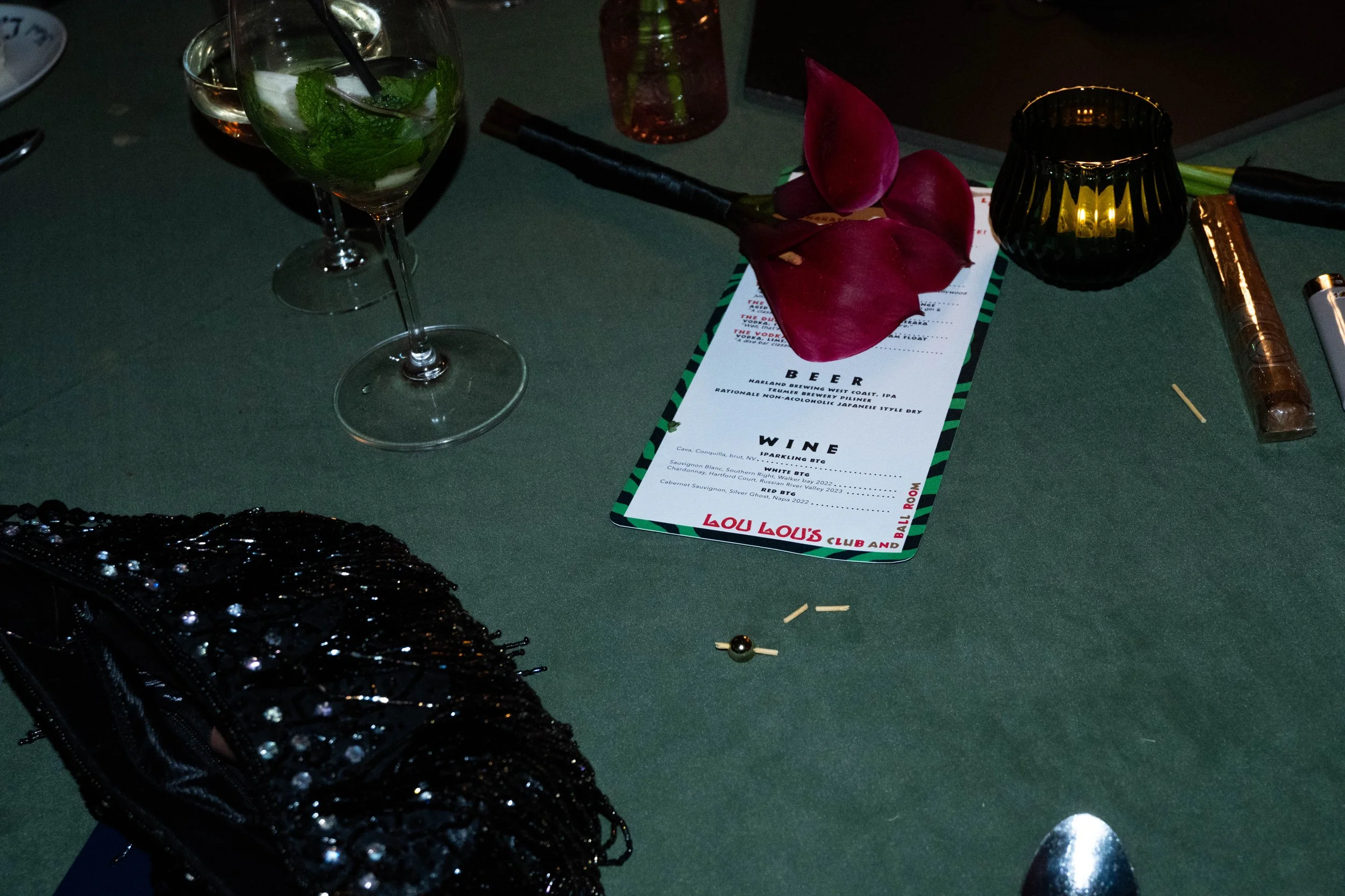 Table setting at a restaurant with a menu, a glass of drink with mint leaves, a black candle holder, a flower, a black beaded purse, and some toothpicks on a green tablecloth.