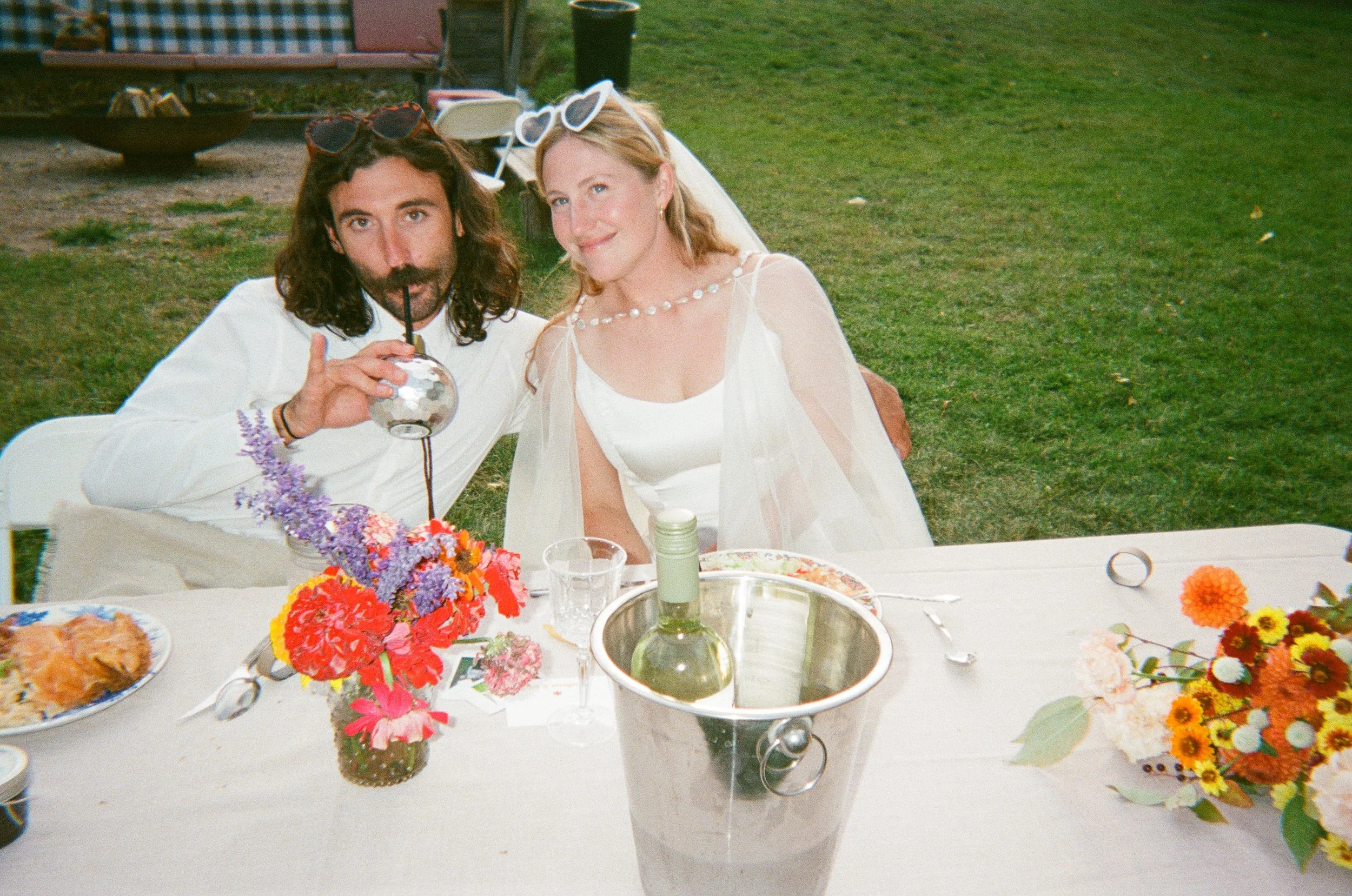 A man and a woman sitting at a dinner table outdoors, dressed for a wedding. The man drinks from a flask with a straw, and the woman wears a white wedding dress and veil. The table has colorful flowers and a bottle in an ice bucket.