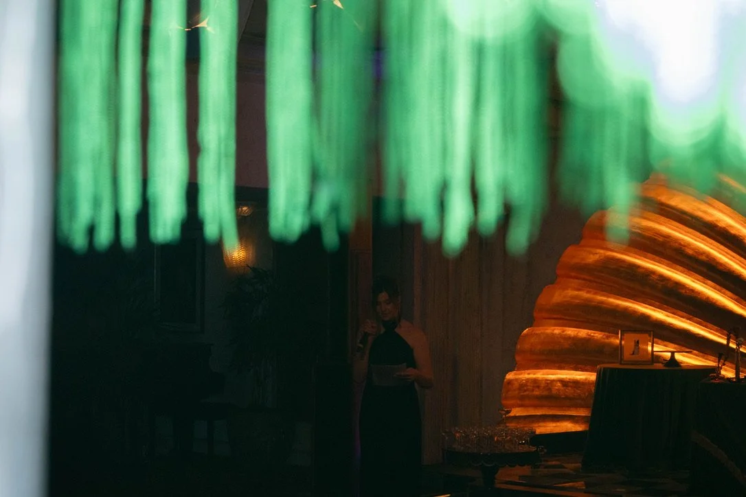 Dimly lit indoor setting with green vertical hanging decorative elements in the foreground, a wooden textured wall with warm lighting shaped like a fan or shell opening, and a woman in a black dress holding a tablet, partially visible in the backgrou