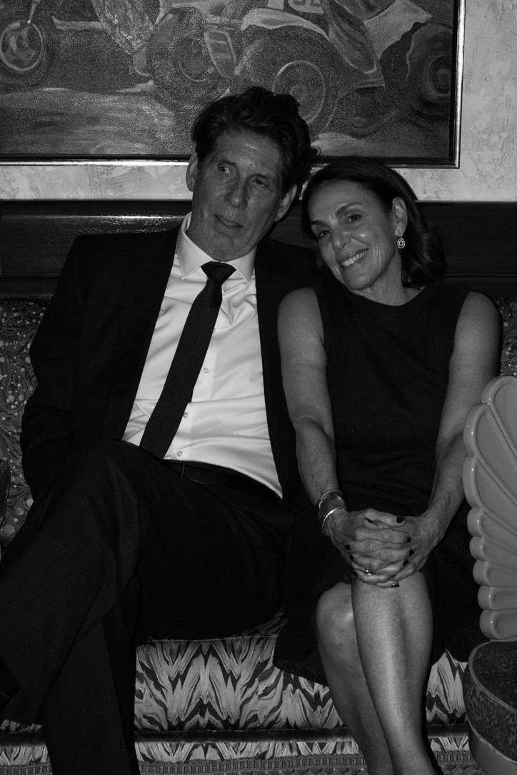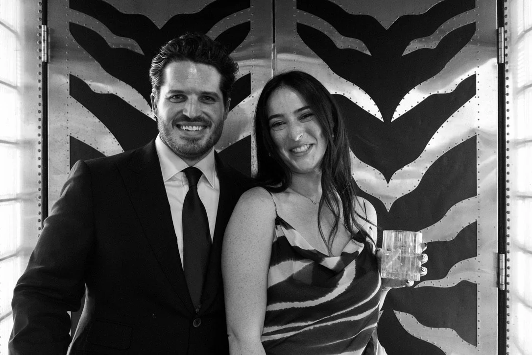 A black and white photo of a man in a suit and a woman in a sleeveless dress sitting closely together on a patterned couch, smiling at the camera.