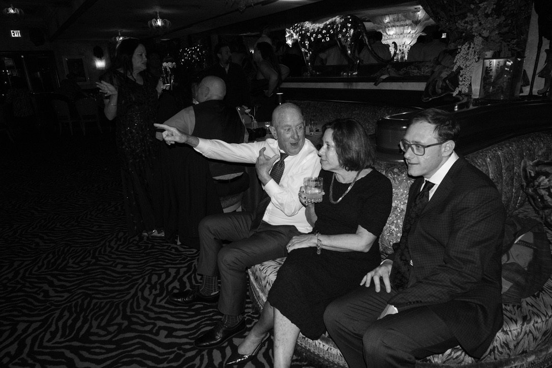 Three people sitting on a couch in a dimly lit bar or lounge, engaged in conversation. One man is gesturing with his arm, holding a drink. Two others, a woman and a man, are listening. Other patrons are visible in the background.
