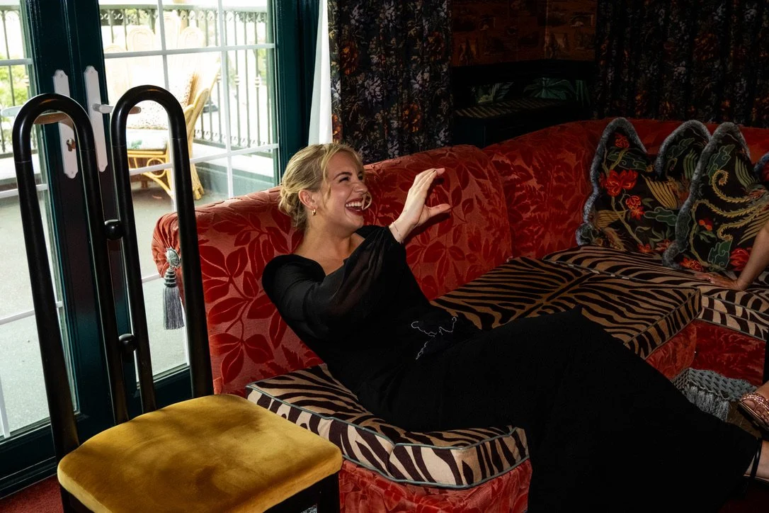 A woman with blonde hair in a black dress sitting on a red floral-patterned sofa, laughing and waving, in a cozy room with colorful curtains and a sliding glass door leading outside.