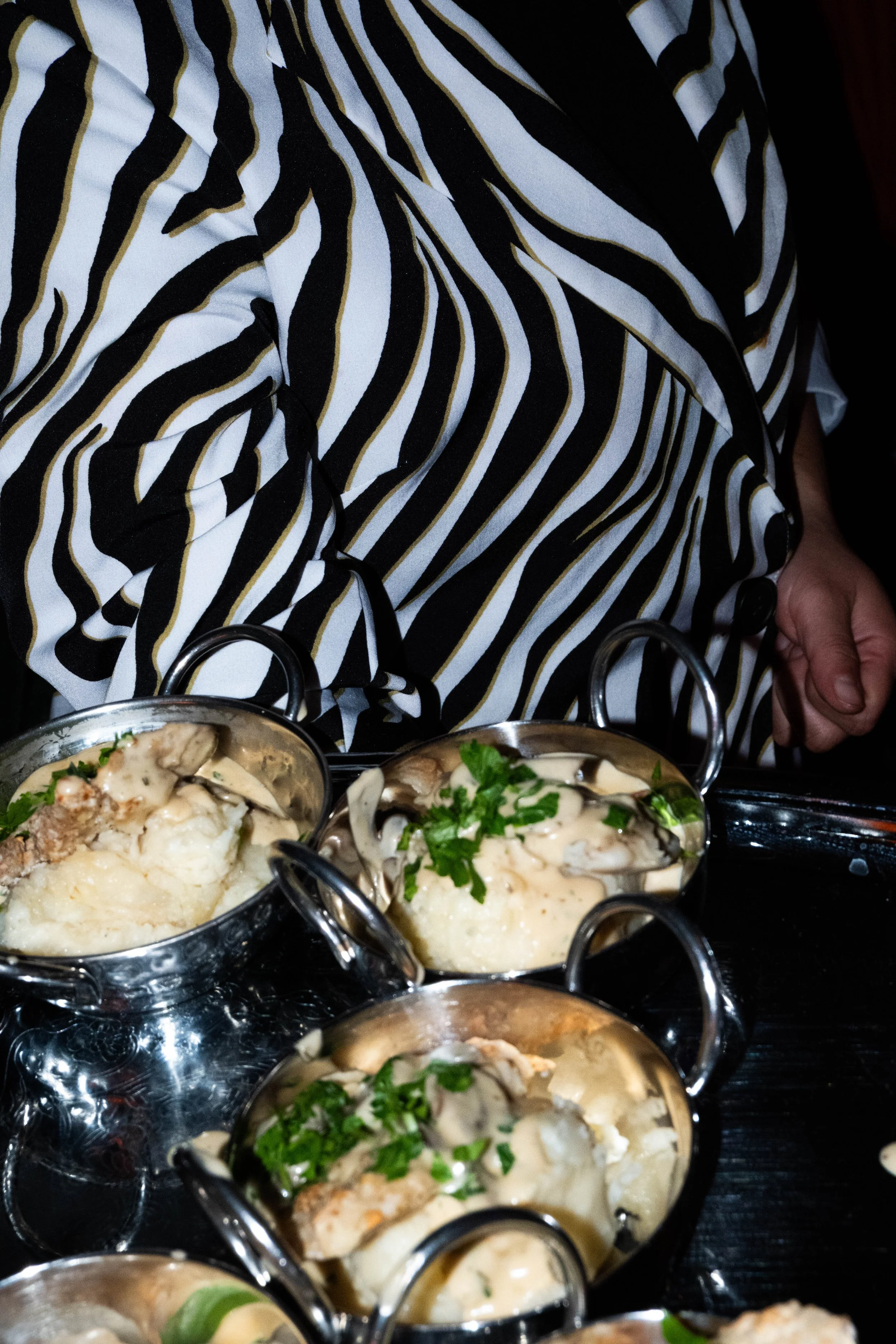 Several small metal bowls of mashed potatoes with gravy and garnished with chopped parsley, placed on a black tray in front of a person wearing a black and white striped shirt.